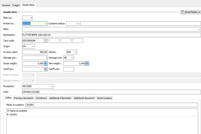 Go to Goods items tab, here you need to add information about you Goods that you need to take out from your customs warehouse.