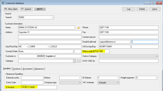 In Emma, add the e-invoice address in the Customer Database or via the CUST button in the Tulli window.