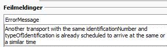 Failure: Another transport with the same identificationNumber and typeOfIdentification is already scheduled to arrive at the same or a similar time