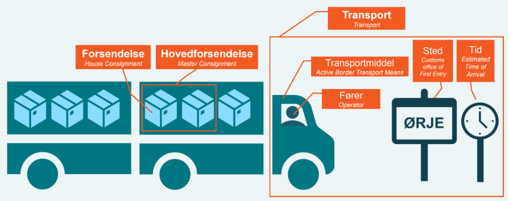 En transport kan inneholde én eller flere hovedforsendelser, og hver hovedforsendelse kan inneholde én eller flere forsendelser.