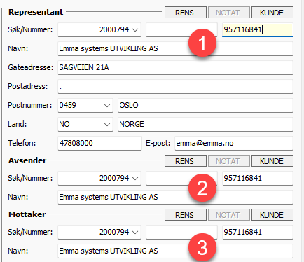 - Representant: Oppgi detaljer om representanten, inkludert organisasjons-/mva-nummer, full adresse, telefonnummer og e-postadresse. Vanligvis er dette ditt eget selskap.