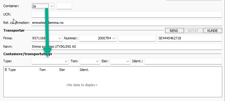 Felt for container/transportutstyr vises kun dersom du velger “JA” på container-feltet