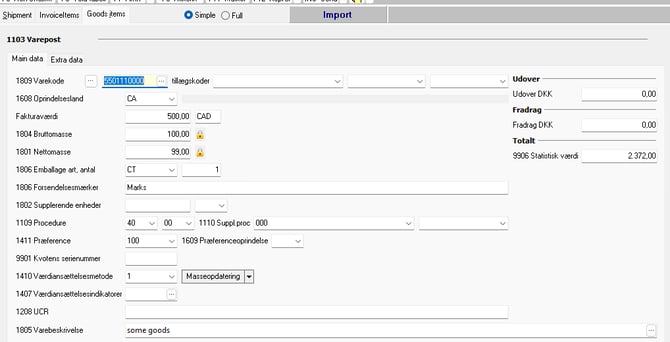 When you have added the relevant information you want to add on Shipment Level, then you can go to "Goods items" and add goods items lines.