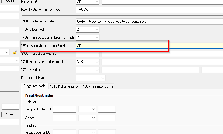if you have a Container you need to select "1" and then you need to add the Container number in "1907 Transportudstyr"